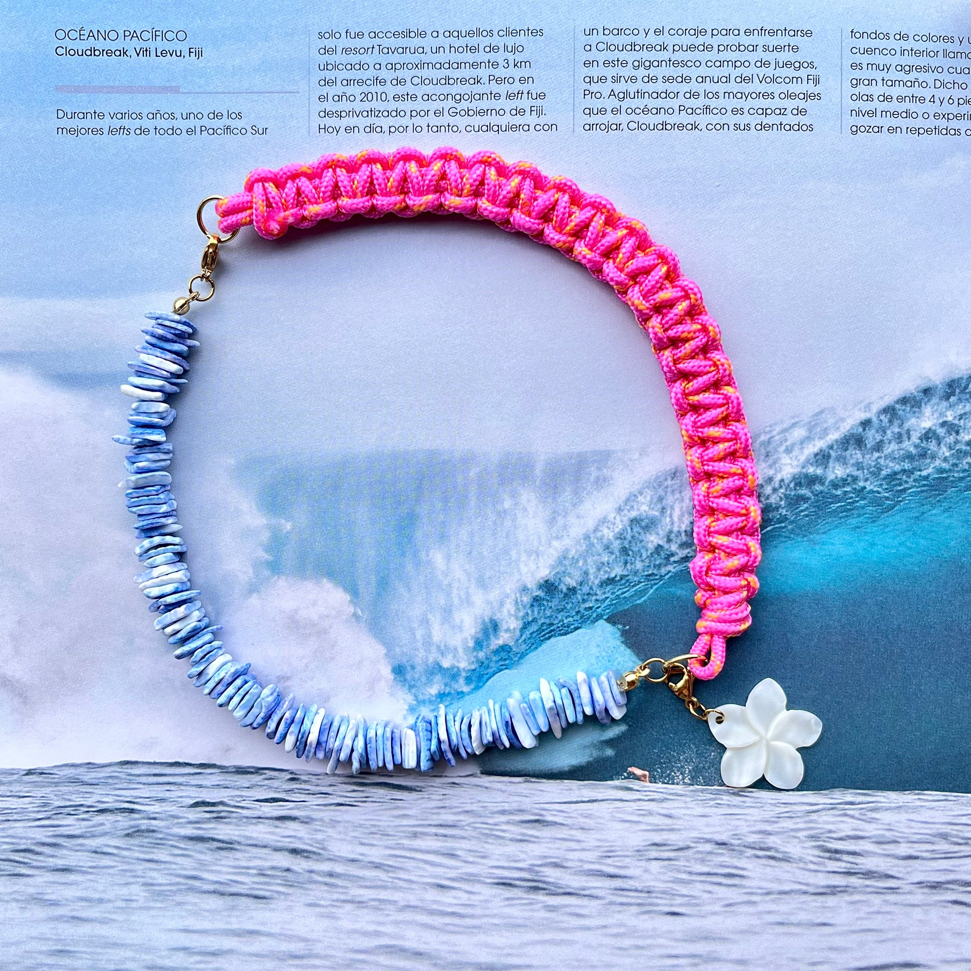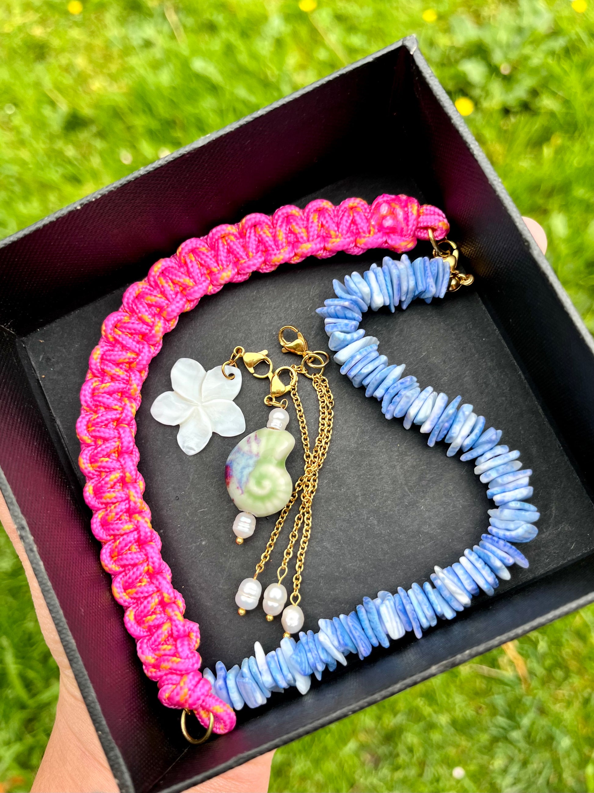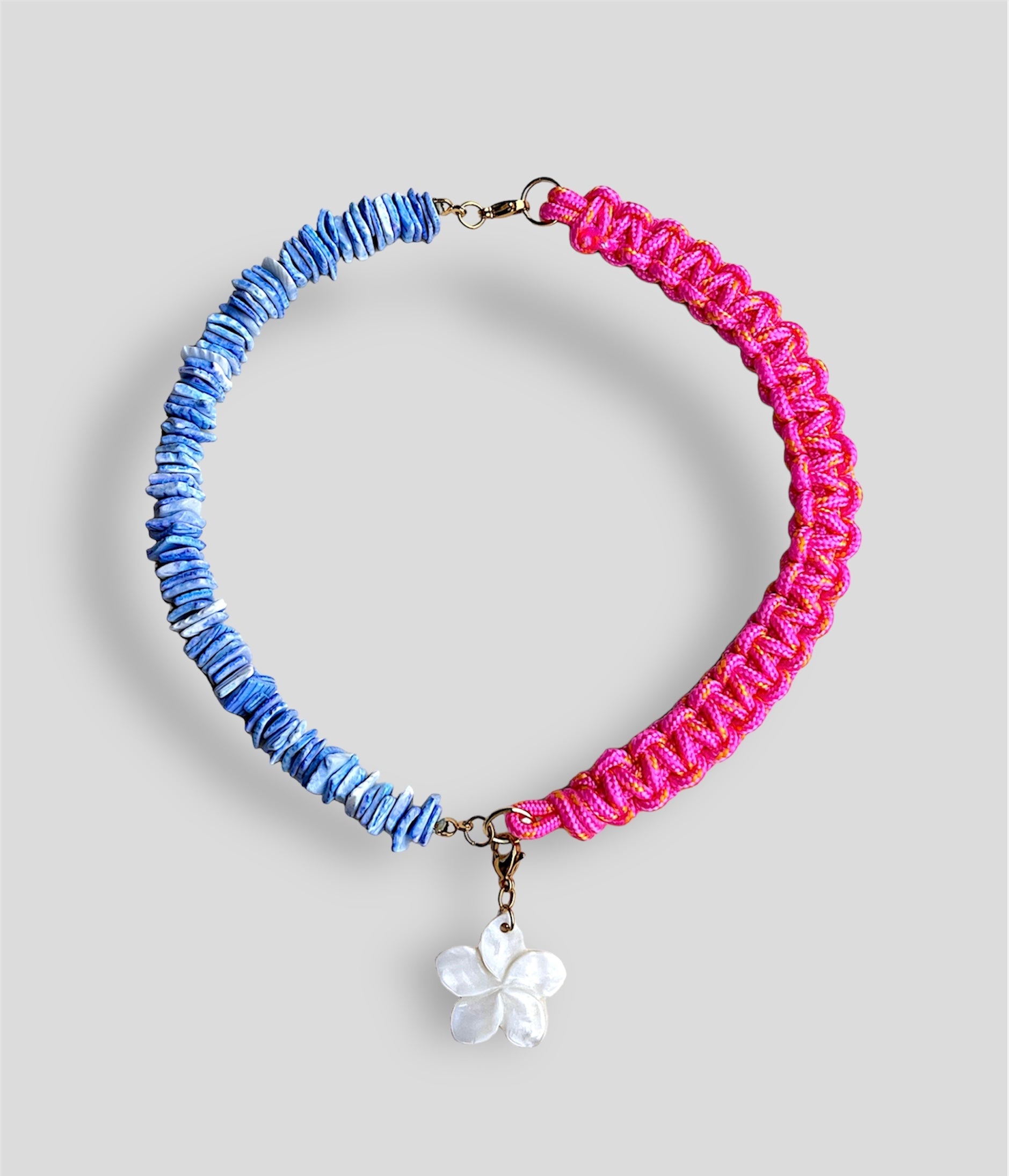 Designed with bubblegum pink paracord and blue shell fragments. Includes a Shell Flower charm. Gold-plated stainless steel clasps and hooks.
