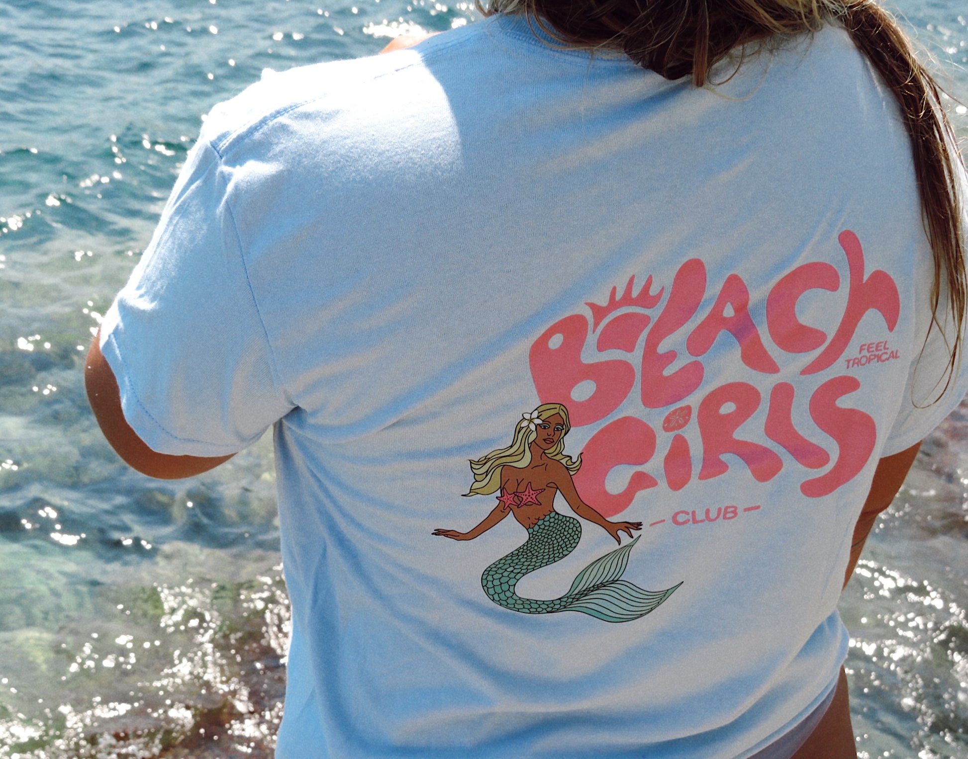 - Estampado trasero “BEACH GIRLS CLUB” con sirena ilustrada