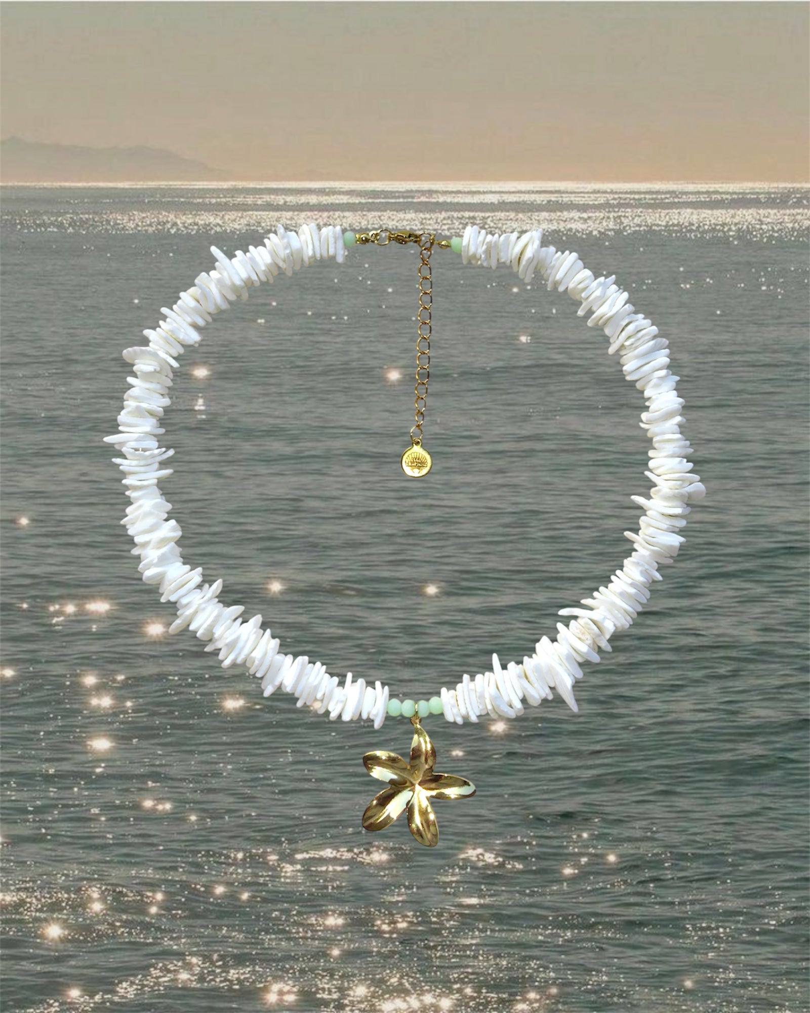 - Materiales: trocitos de conchas blancas y colgante dorado de acero inoxidable