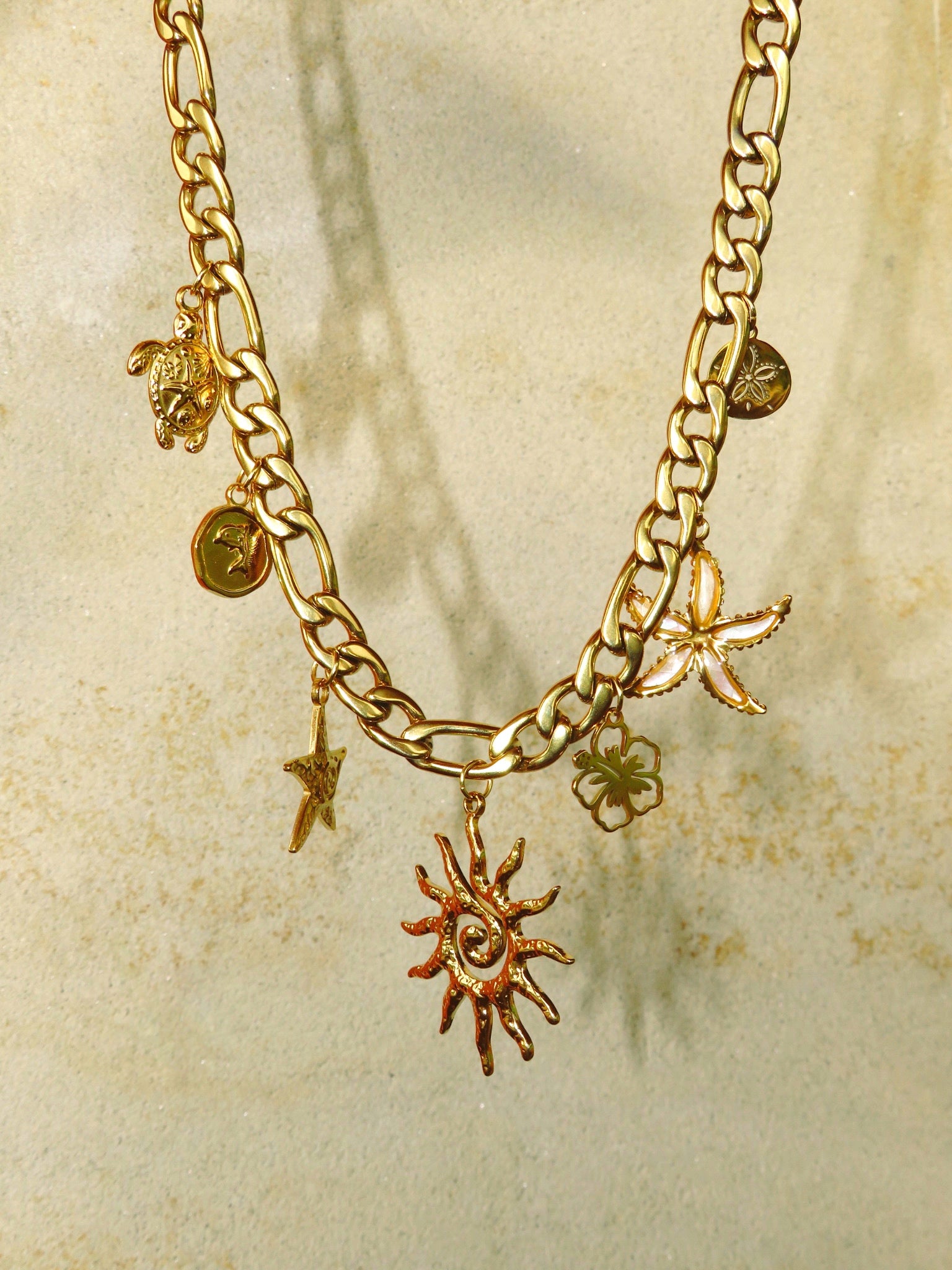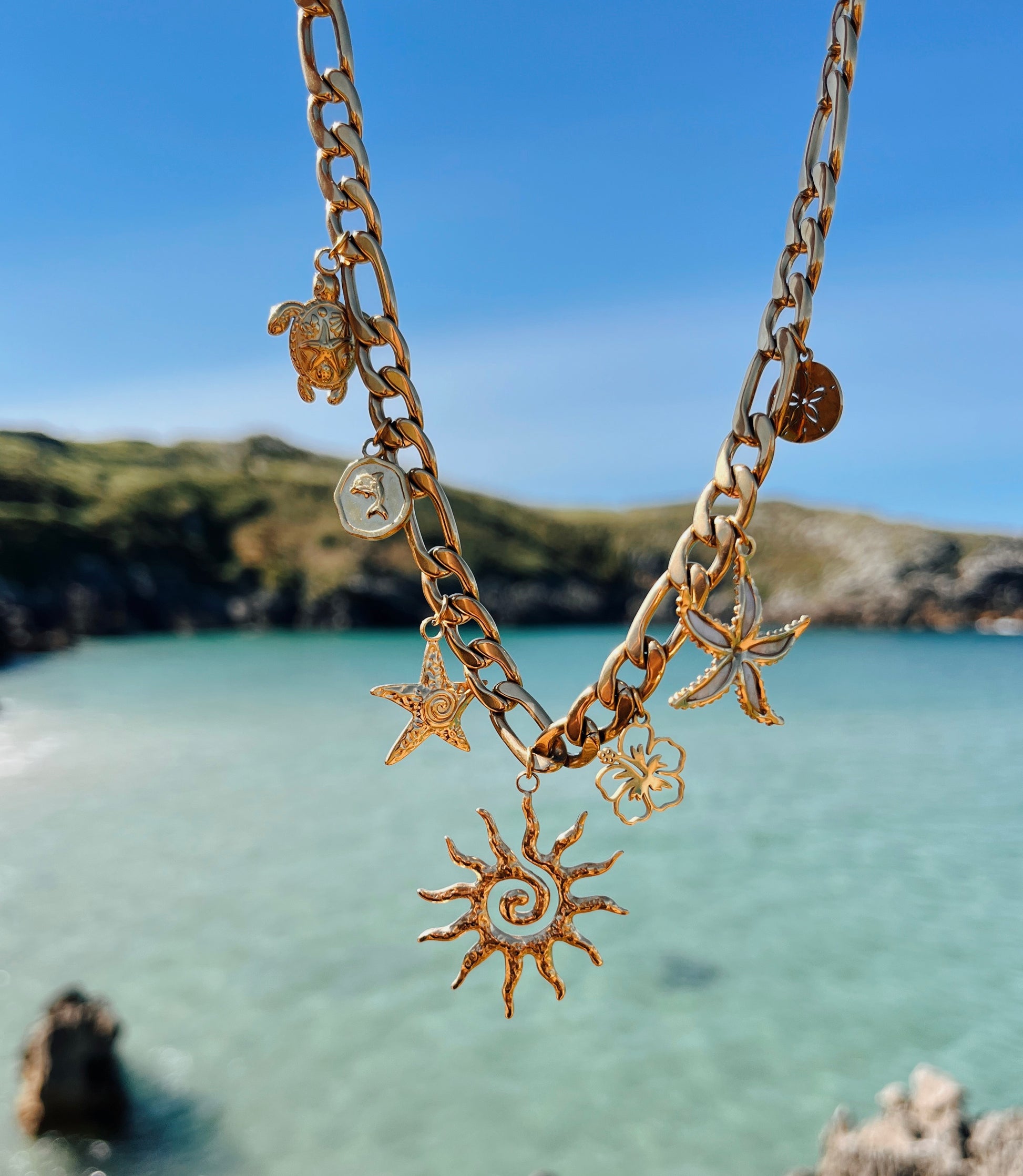 La Caraïbe n'est pas discrète, et elle n'est pas faite pour passer inaperçue. Chaque charm raconte une histoire : le soleil flamboyant, l'étoile de mer, la tortue voyageuse... une pièce pour ceux qui n'attendent pas les vacances pour briller. Emportez avec vous un petit morceau des Caraïbes.