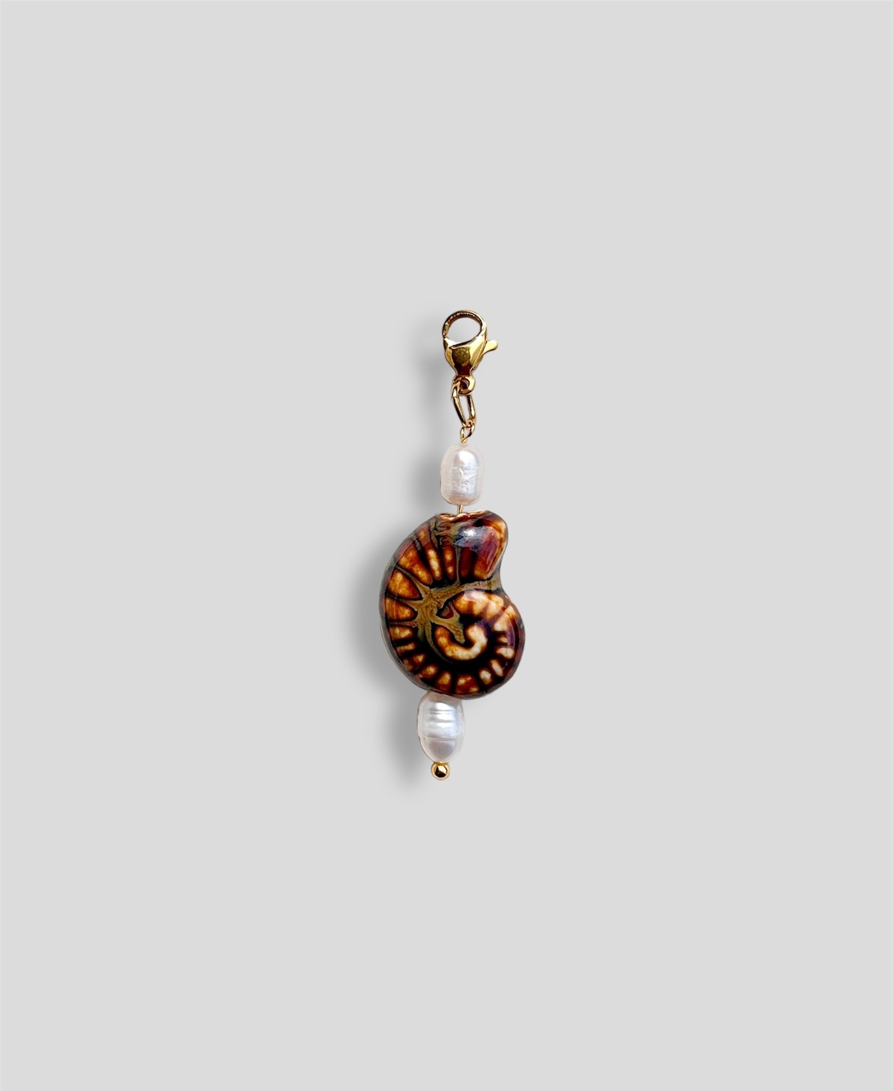 Charm de caracola chocolate de cerámica. Adornado con dos perlas de agua dulce. Enganche disponible en dorado y plateado.