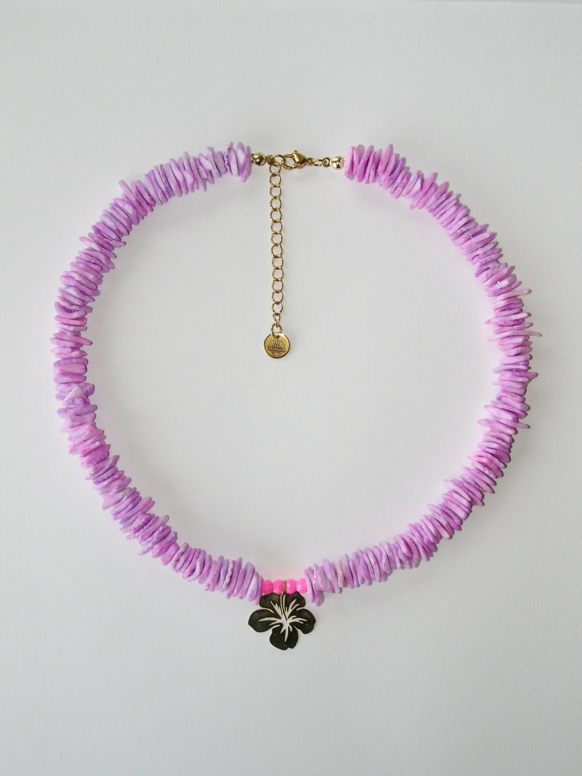 Lleno de color y frescura, el collar Honolulu le da a tu look ese toque tropical que nunca falla. Formado por trocitos de conchas en tonos pastel y un dije dorado de flor hawaiana, es ideal para días de sol, playa o simplemente para sentirte en modo verano.