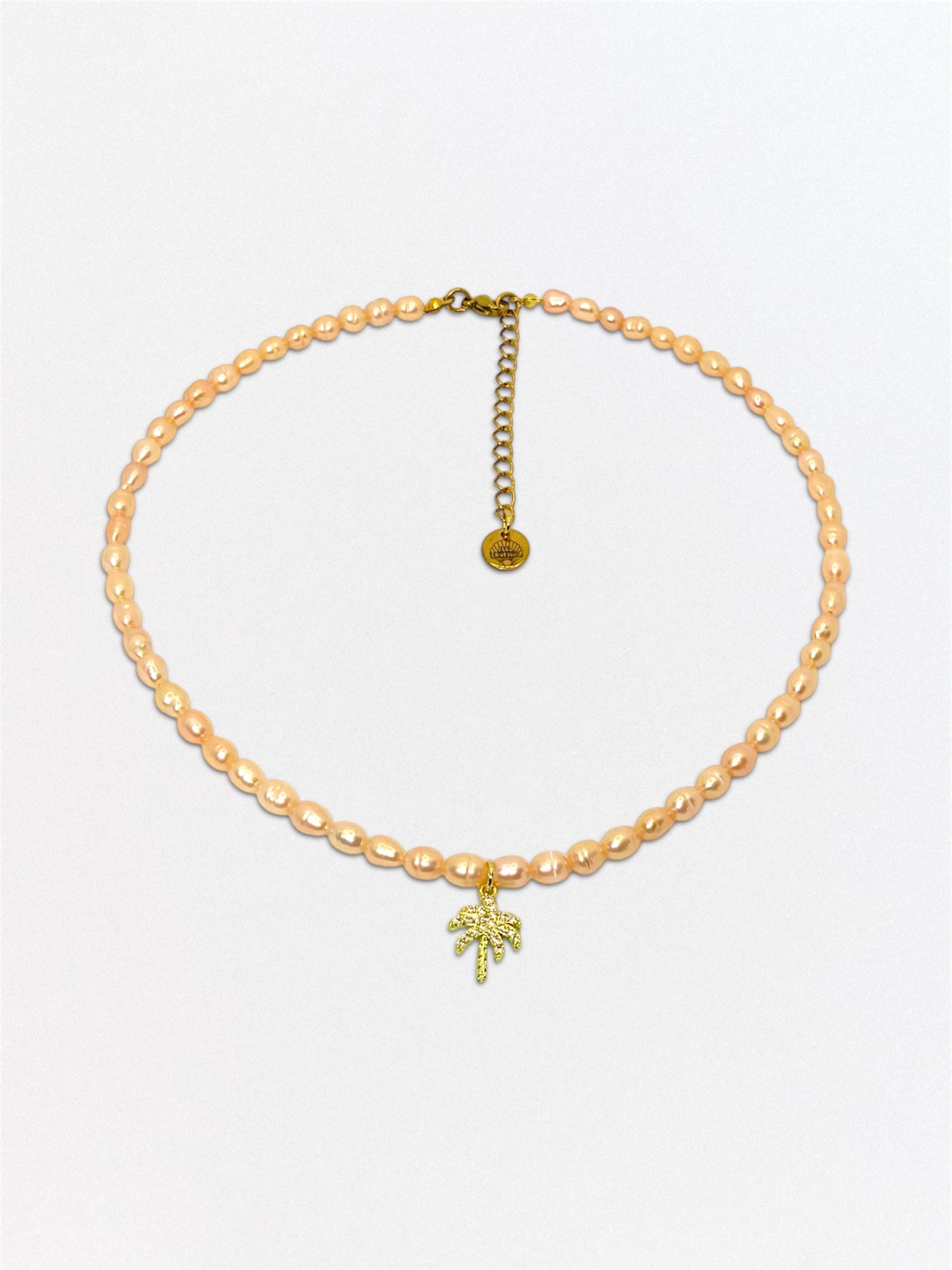 Peach Palm combina perlas en tono melocotón con una palmera delicada compuesta por circonitas. Una pieza ligera, pensada para convivir con la piel y el ritmo del día a día, sin imponerse.