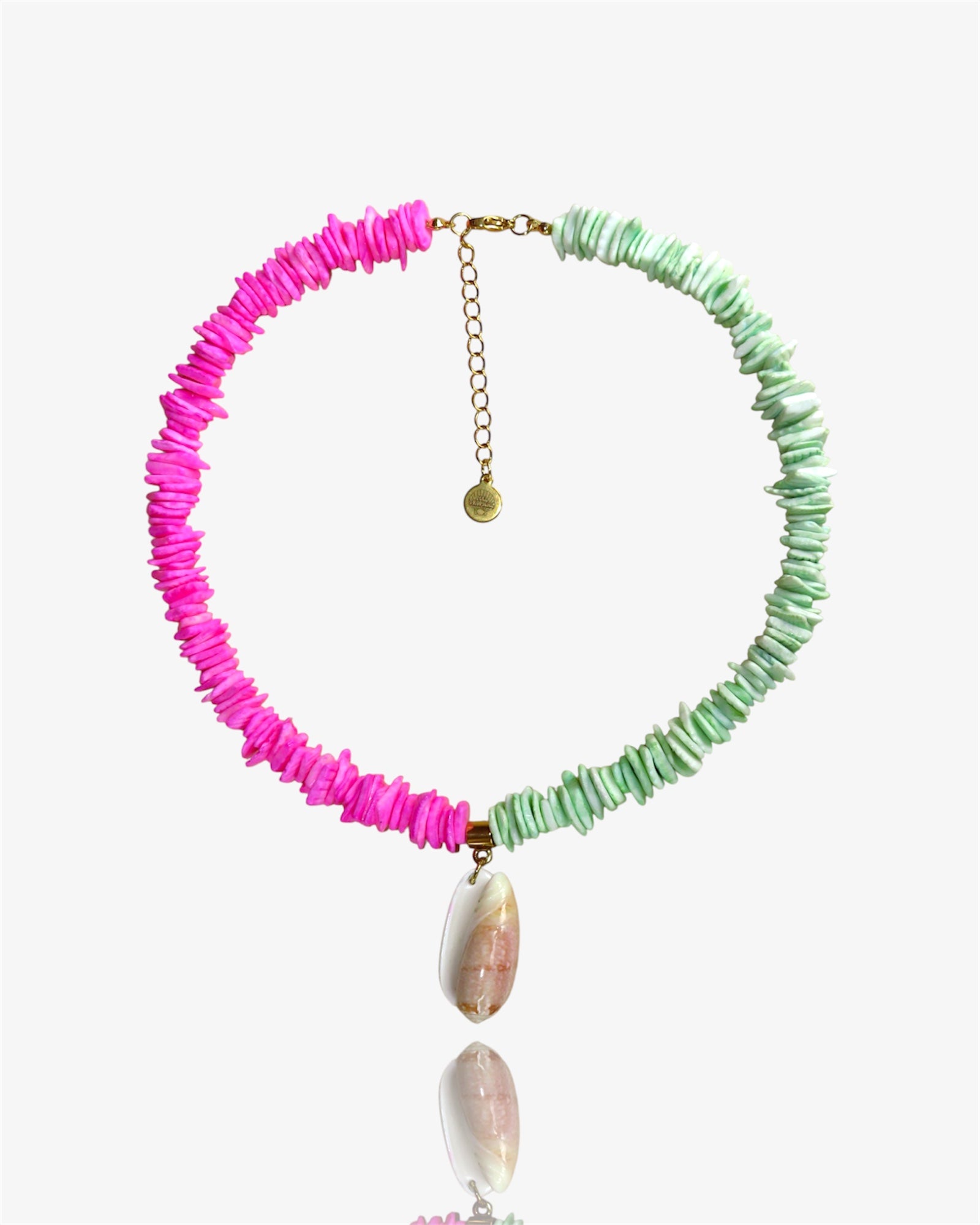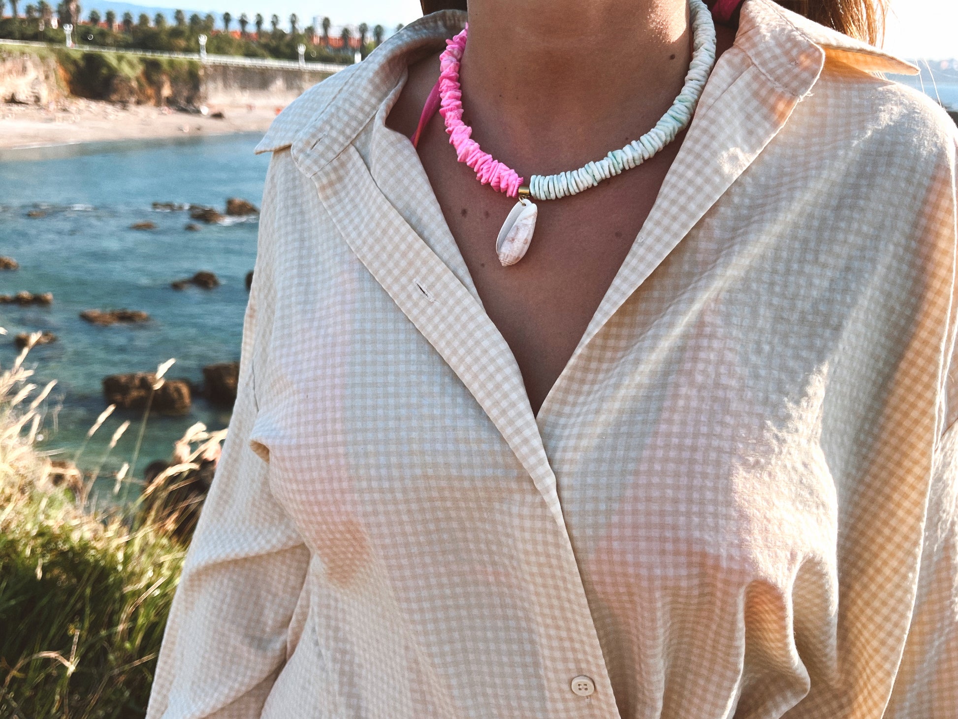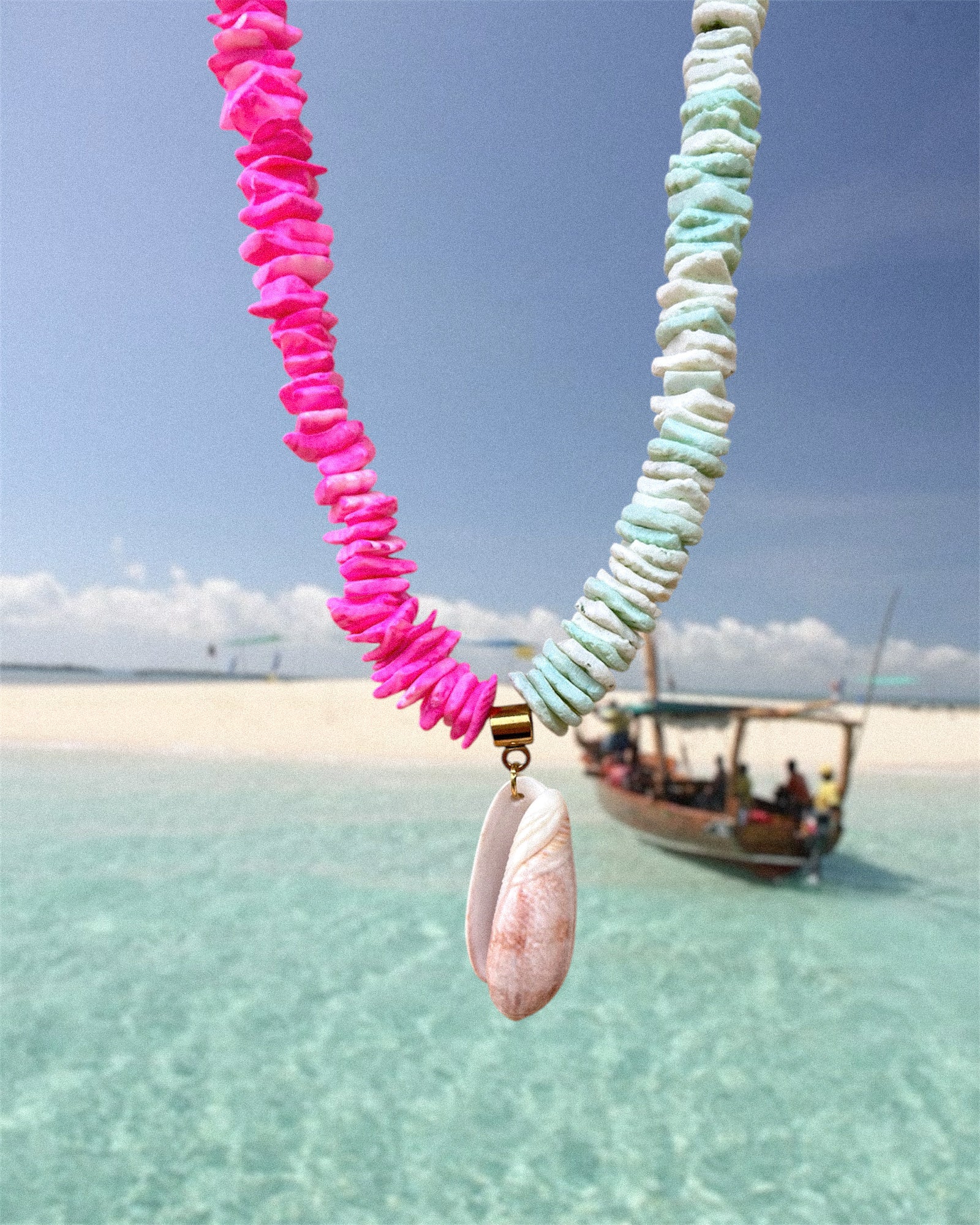 Minimalista con alma isleña. Inspirado en la costa de Zanzíbar, este collar combina cuentas heishi en rosa y turquesa con una concha natural central. Fresco, ligero y fácil de llevar - el típico accesorio que no te quitarás en todo el verano.