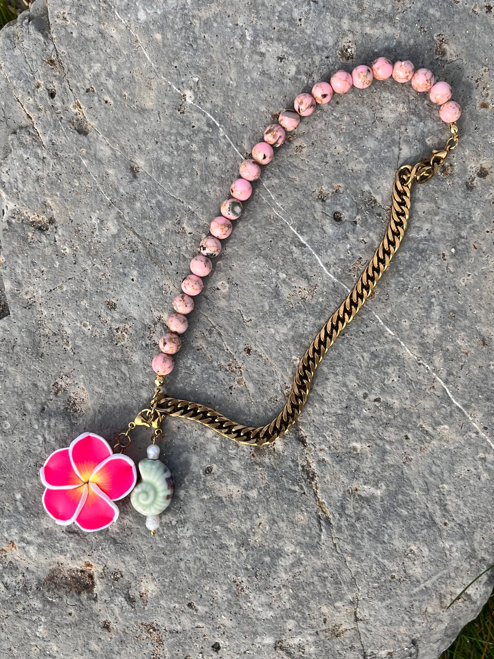 Charm Flor de Hibisco rosa fucsia. Enganches de acero inoxidable. Disponible en dorado y plateado.