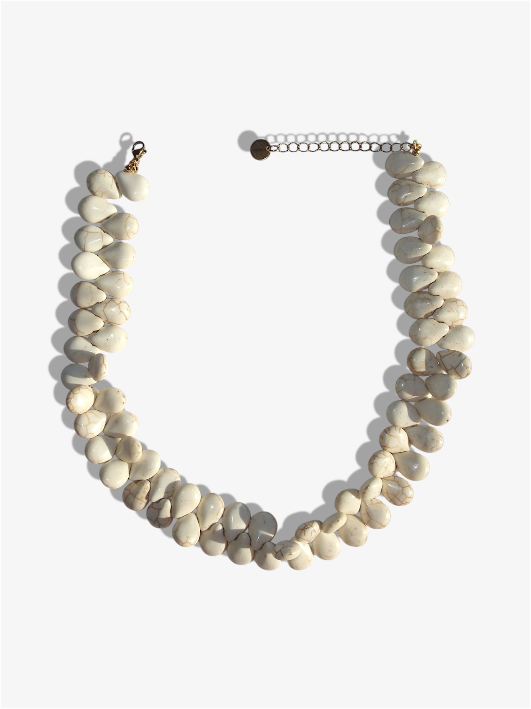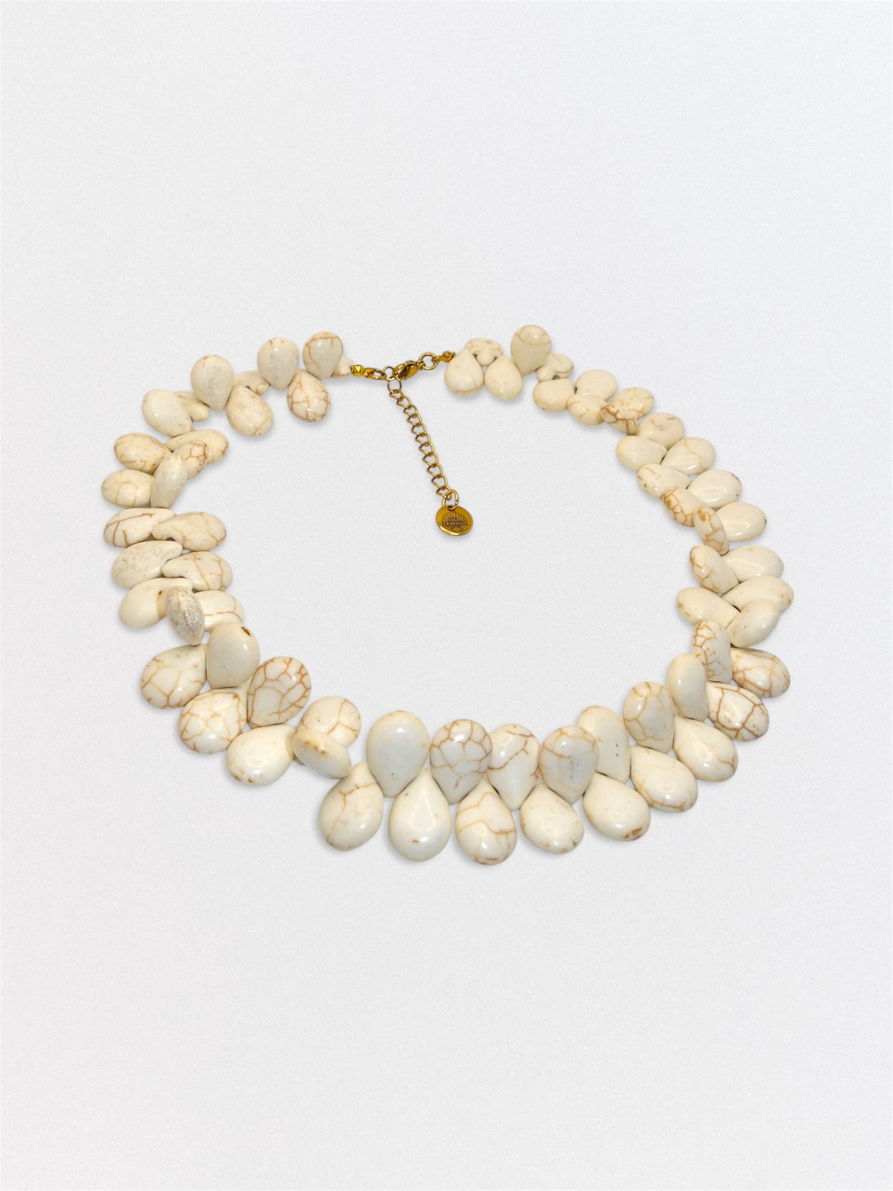 El Collar Kalua está inspirado en las playas vírgenes de arena fina. Compuesto por lágrimas de piedras naturales color marfil y vetas beige, cada cuenta refleja la belleza orgánica y elegante de la naturaleza.