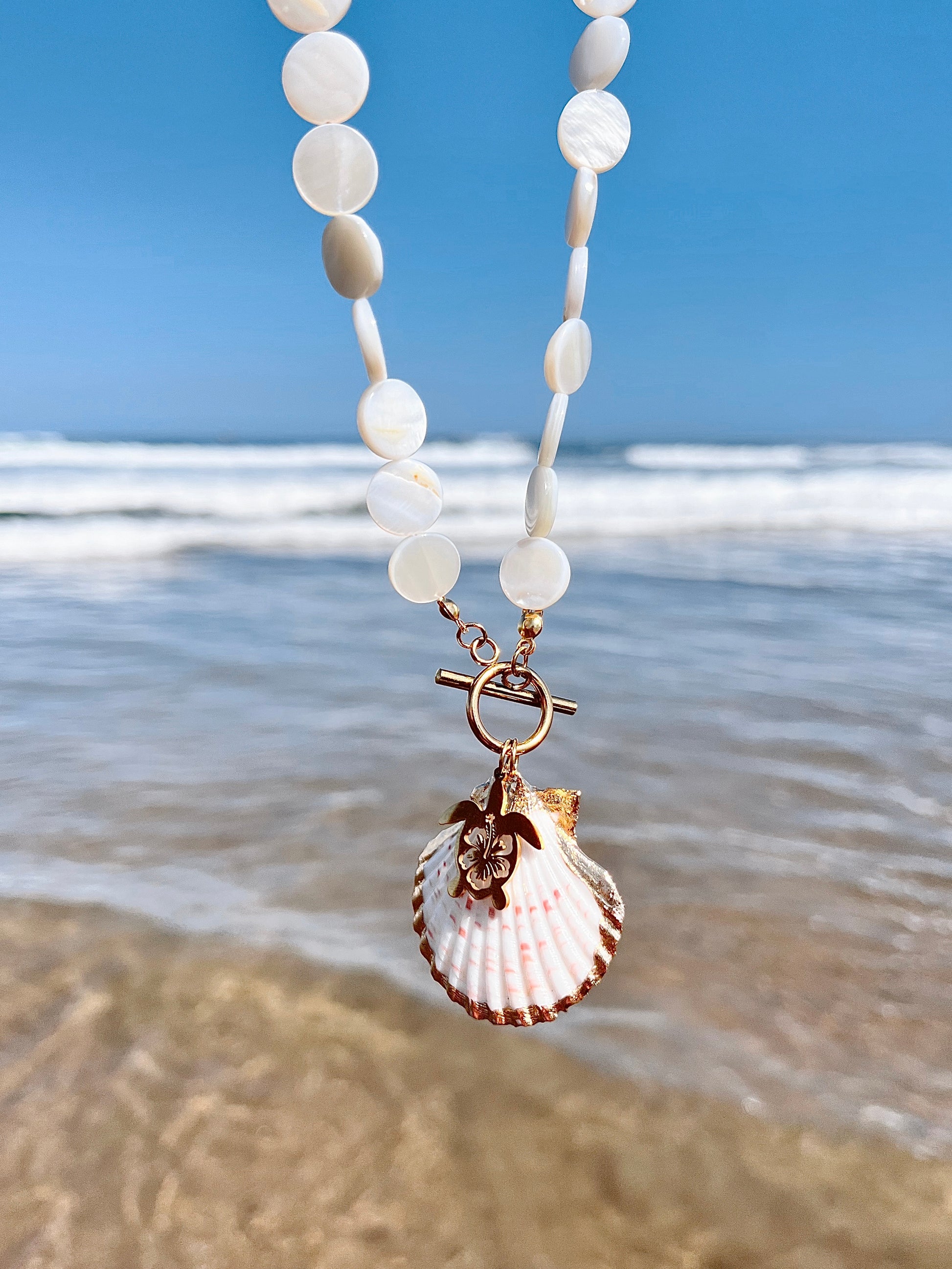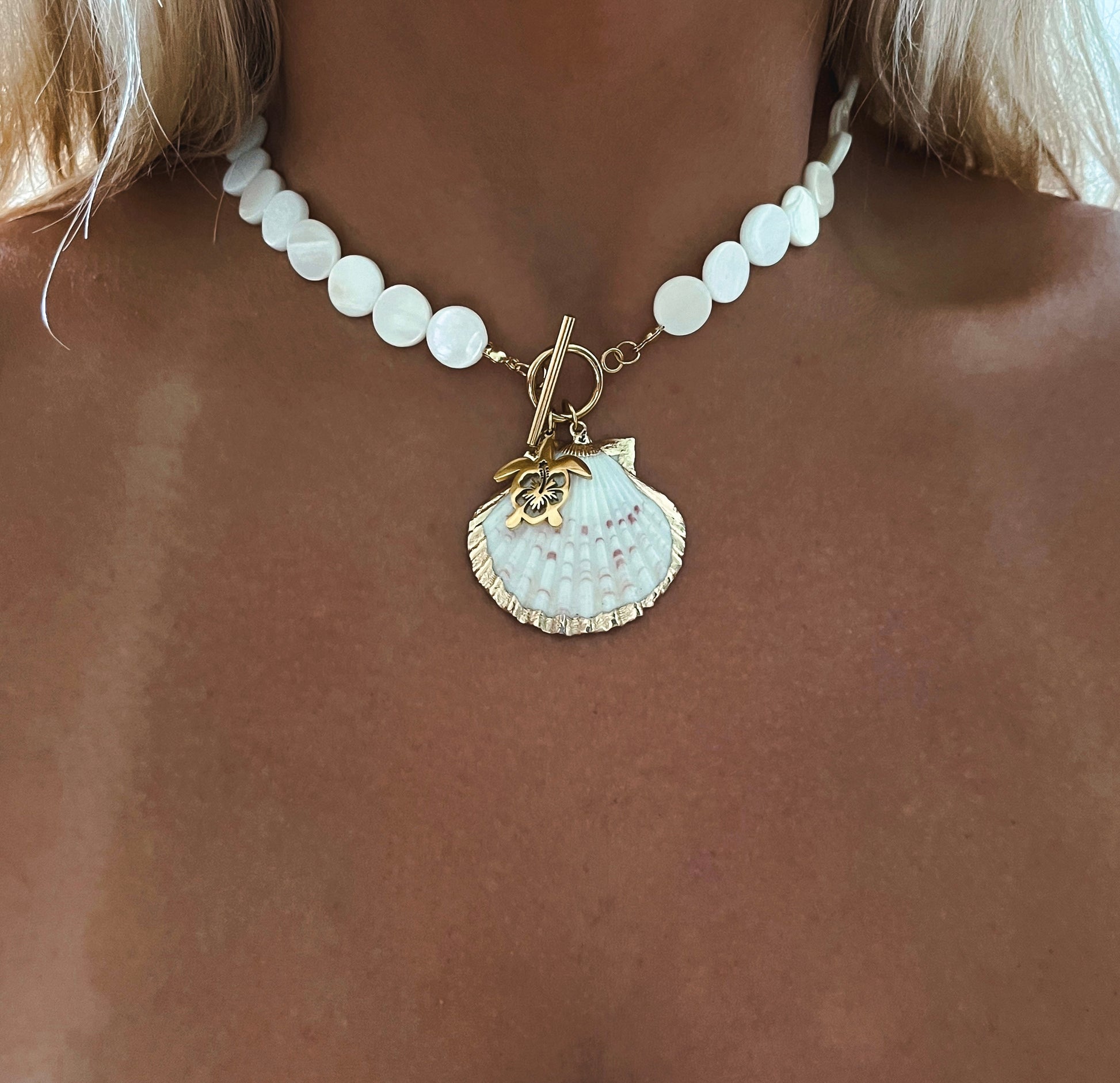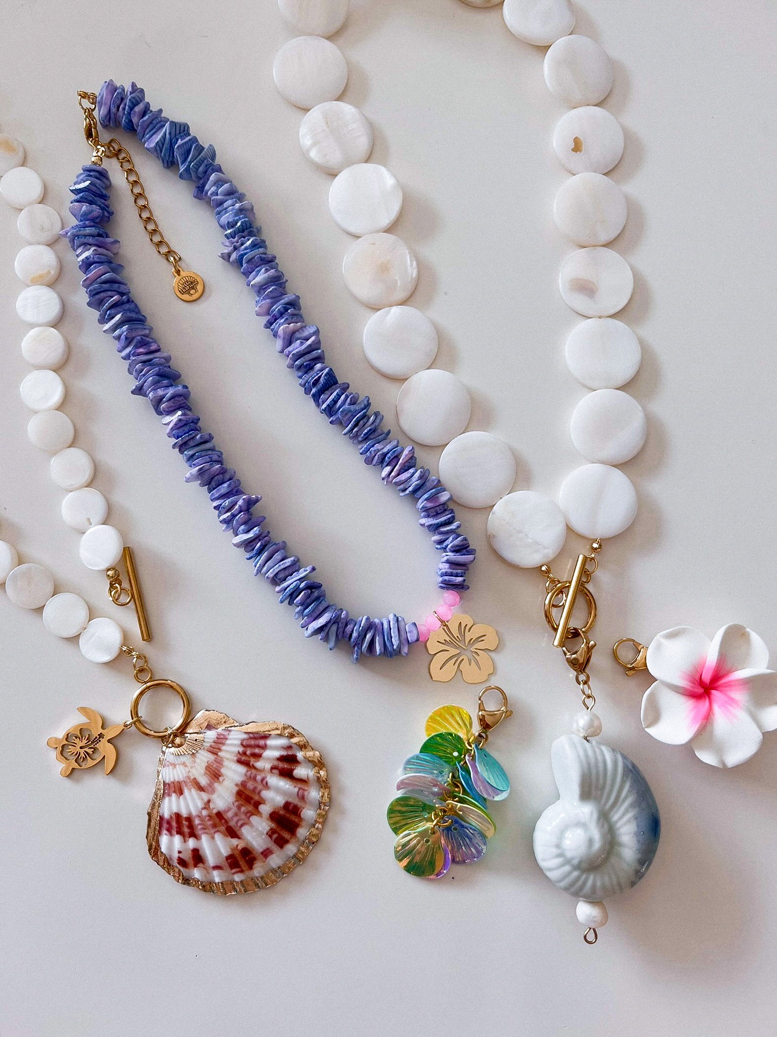 Lo natural nunca fue tan chic. NALU mezcla medallones de nácar, una concha plana y una tortuga dorada de acero inoxidable para crear el collar más fresco y estiloso. ¡El detalle que te hará sentir como si estuvieras siempre cerca del mar!